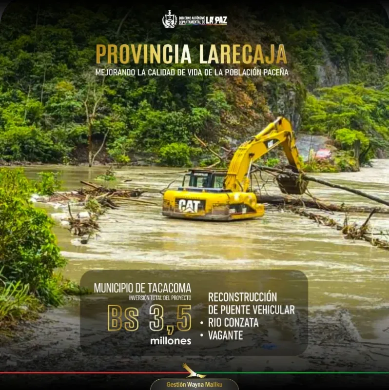 Trabajando por el progreso del departamento de La Paz, se está ejecutando la obra de reconstrucción del puente vehicular Río Conzata-Vagante. Este proyecto, con una inversión significativa de Bs 3,5 millones, se convertirá en un punto vital de conectividad para el municipio de Tacacoma. La finalidad es esencialmente productiva: garantizar que las familias puedan transitar con seguridad y transportar sus productos a otras poblaciones, impulsando así la actividad económica de la región.