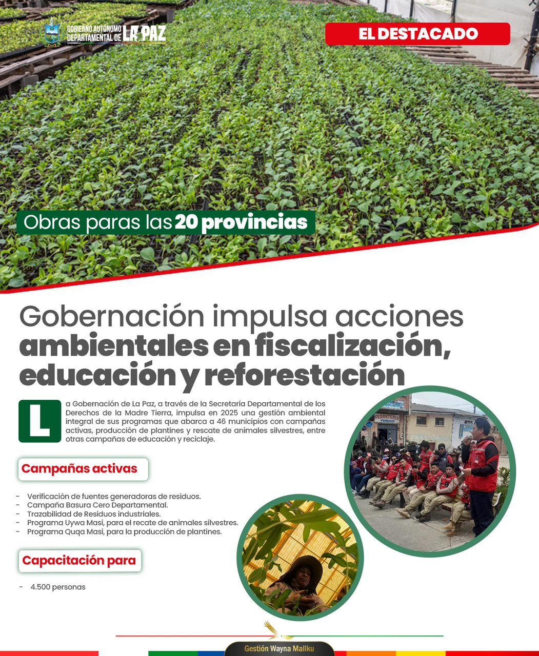 La Gobernación de La Paz, a través de la Secretaría Departamental de los Derechos de la Madre Tierra, impulsa en 2025 una gestión ambiental integral de sus programas que abarca a 46 municipios con campañas activas, 41.230 plantines producidos y 187 animales silvestres rescatados y atendidos, entre otras campañas de educación y reciclaje.
