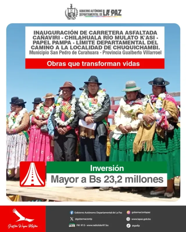 El Gobernador Santos Quispe inauguró un tramo vital de carretera asfaltada que abarca 8,06 kilómetros en el municipio de San Pedro de Curahuara. La obra, que conecta Cañaviri con el límite departamental (vía Chuquichambi) a través de Chilahuala Río Mulato K'asi y Papel Pampa, representa un importante paso de integración para la Provincia Gualberto Villarroel. El proyecto, entregado el 19 de septiembre de 2025, tuvo una inversión total de Bs 24 millones, de los cuales la Gobernación aportó Bs 20,4 millones, complementado por el aporte de la Alcaldía de San Pedro de Curahuara.