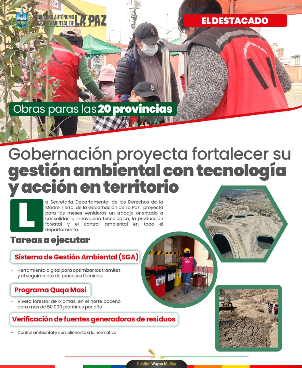 La Gobernación de La Paz, a través de la Secretaría Departamental de los Derechos de la Madre Tierra, consolidó entre 2021 y 2025 una gestión ambiental integral que abarca la fiscalización de residuos, campañas de reforestación, proyectos de recuperación de suelos, rescate de fauna silvestre y programas de educación ambiental; con más de 80 controles a botaderos, la entrega de más de 52.500 plantines, el rescate de 700 animales y la implementación de un sistema digital de gestión ambiental, reafirmando su compromiso con el desarrollo sostenible y la protección del patrimonio natural del departamento.