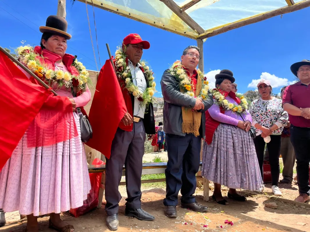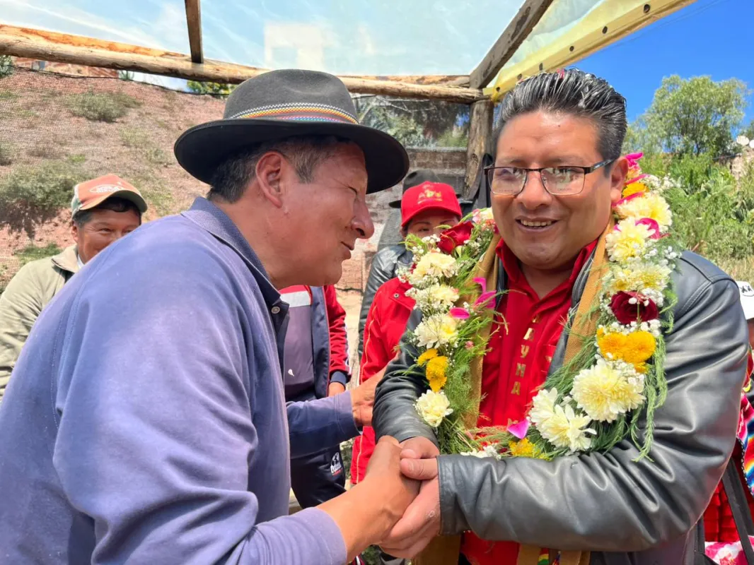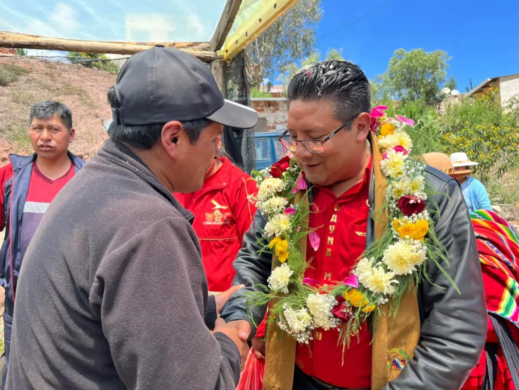"El liderazgo no se mide desde la mesa de un escritorio, sino en el campo, escuchando las necesidades del pueblo y trabajando para cumplir cada promesa", destacó Santos Quispe en compañía del candidato a alcalde de Mecapaca, Ever Venegas.